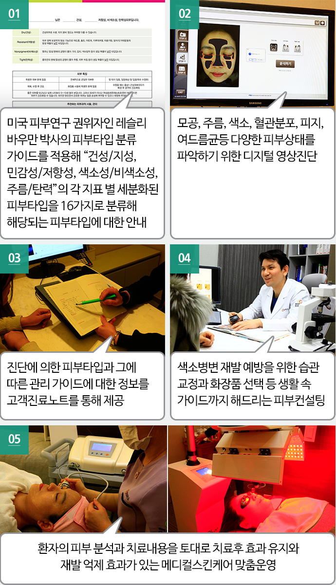 건성/지성, 민감성/저항성, 색소성/비색소성, 주름/탄력 등 각 요소를 분석 평가해 피부타입에 맞는 화이트닝 효과의 필링제를 선별하고 관리사의 능숙한 스킨케어 테크닉에 의해 안정적인 필링을 시행합니다.