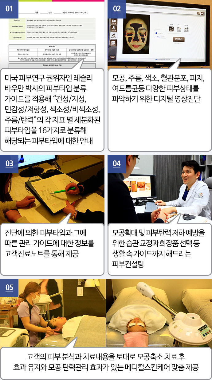 개인 별 피부 탄력과 모공 상태를 비롯한 피부 분석 결과에 맞춰 필요한 경우 피부탄력을 높이는 메디컬스킨케어 프로그램을 맞춤 병행함으로써 모공 확대 억제를 더 효과적으로 할 수 있습니다.