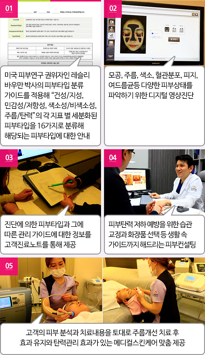 건성/지성, 민감성/저항성, 색소성/비색소성, 주름/탄력 등 각 요소를 분석 평가해 피부타입에 맞는 탄력 개선 효과와 항노화 효과의 필링제를 선별하고 관리사의 능숙한 스킨케어 테크닉에 의해 안정적인 필링을 시행합니다.