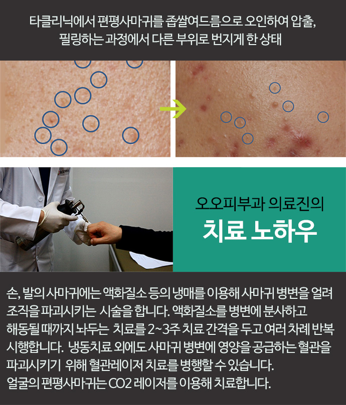 이 발바닥사마귀와 유사한 티눈과 감별해 치료해야 합니다. 어린이의 손발에 생기는 사마귀는 치료해주지 않으면 전염의 위험뿐 아니라 손톱 발톱의 변형을 일으킬 수 있어 주의해야 합니다.